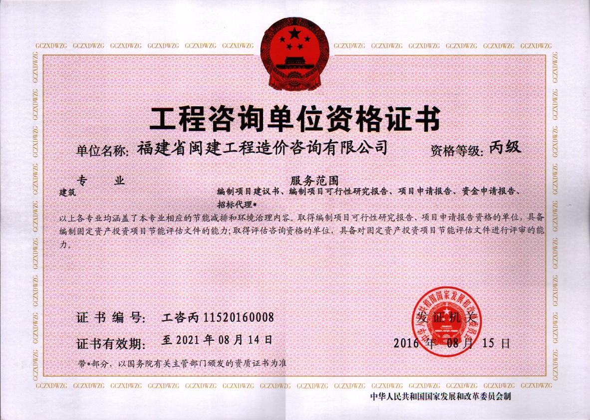 福建省閩建工程造價(jià)咨詢(xún)有限公司成立于1993年,原隸屬福建省建設(shè)委員會(huì),2001年脫鉤改制為有限責(zé)任公司,公司注冊(cè)資本1200萬(wàn)元,是一家具有甲級(jí)工程招標(biāo)代理資質(zhì)(證書(shū)編號(hào):F135000429)、甲級(jí)工程造價(jià)咨詢(xún)資質(zhì)(證書(shū)編號(hào):甲150135000084)、政府采購(gòu)代理資質(zhì)、預(yù)備級(jí)中央投資項(xiàng)目招標(biāo)代理機(jī)構(gòu)資質(zhì)(證書(shū)編號(hào):ZYTZ-C2013239)、丙級(jí)工程資質(zhì)(證書(shū)編號(hào):工咨丙11520160008)的綜合性工程咨詢(xún)服務(wù)單位。能承擔(dān)各類(lèi)建設(shè)項(xiàng)目的工程招標(biāo)代理、工程造價(jià)咨詢(xún)...